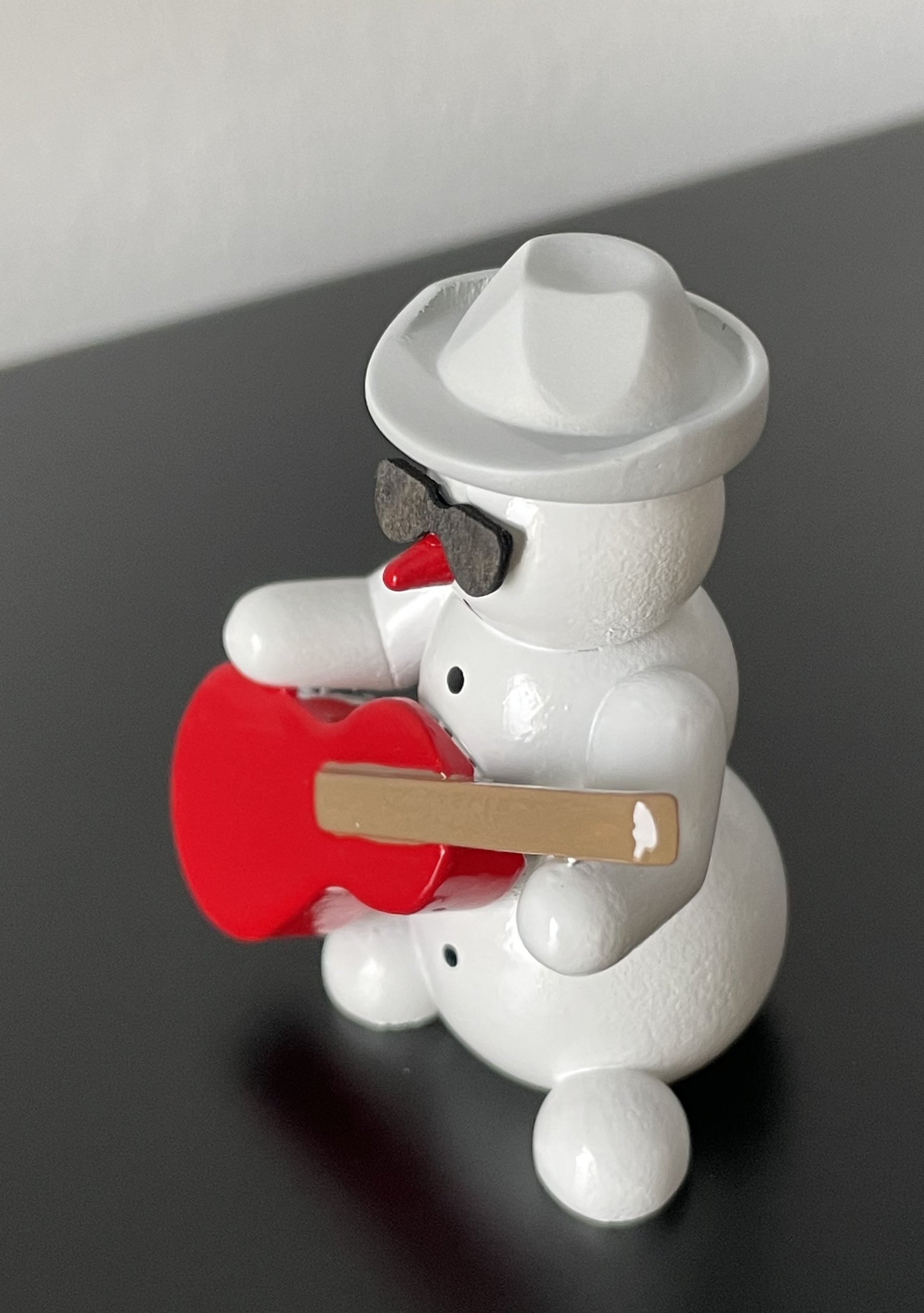 Deko Figur Snowman Schneemann Musiker Gitarrist aus Holz echt handbemalt, mit roter Gitarre, Sonnenbrille und grauem Hut